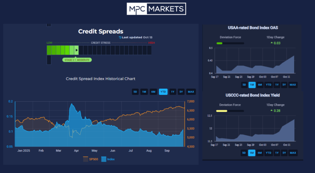 Let’s start with the basics. Credit spreads act as a barometer for investor confidence in corporate debt. When spreads are tight, as they’ve been for much of this year, it signals that markets perceive low default risks and are comfortable lending to companies at rates close to Treasuries. A recent snapshot from MPC Markets, updated as of October 13, illustrates this: the USAA-Rated Bond Index Option-Adjusted Spread (OAS) sits at a deviation force of 0.5 with a modest 1-day increase of 0.03, while the broader Credit Spread Index has trended downward from around 0.15 in January to below 0.1 recently, hovering in “Stage 2.1: Moderate” territory. This low-stress environment has coincided with a robust S&P 500 rally, as seen in overlaid charts where equities (in orange) climb steadily against the blue credit index line.
