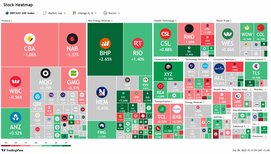 Materials led the rally, driven by stronger copper prices, with Sandfire Resources jumping 5.5 per cent, BHP up 2.5 per cent, and Rio Tinto gaining 1.5 per cent. Lithium producers also advanced, including Lake Resources (+3.1%), IGO (+2.2%), and Mineral Resources (+1.3%).