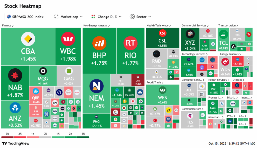 Gold miners rallied as bullion reached a record US$4185 an ounce, with Newmont and Perseus each up 1.3 per cent. BHP, Fortescue, and Rio Tinto all advanced more than 1 per cent.