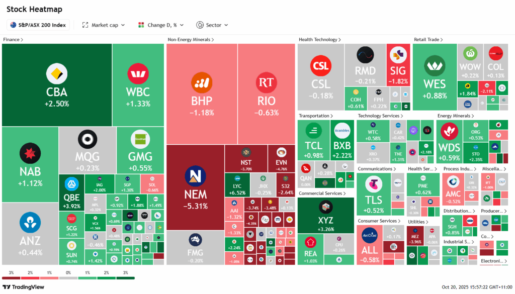 Nine of eleven sectors advanced, led by technology, while materials dragged with a 1.5 per cent fall as investors sold down gold and critical minerals stocks. Newmont, Evolution, and Perseus each plunged over 5 per cent, despite gold prices stabilising. Iluka dropped 6.8 per cent, while BHP and Rio Tinto softened on weaker iron ore.