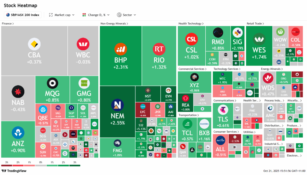 The materials sector surged nearly 2 per cent as Alcoa gained 7.7 per cent and Arafura Rare Earths rose 3.4 per cent following news of a $US3 billion joint investment plan to support key mineral projects. BHP advanced 2.46 per cent after reporting record iron ore output, while gold miners Evolution and Regis climbed 4 per cent as bullion hit $US4381 an ounce.