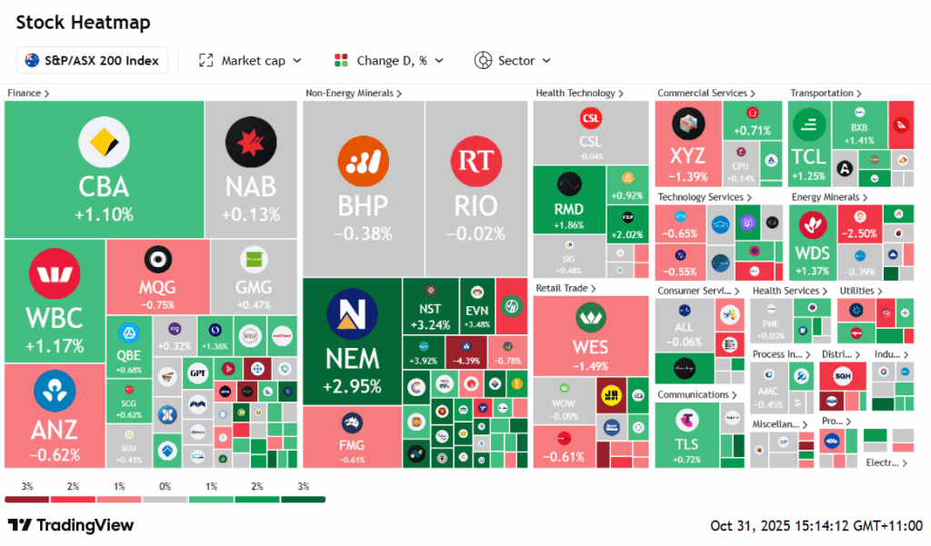 Gold producers led the rally as the commodity jumped 2.5% following positive signals from the Trump–Xi meeting, where China committed to resume US soybean purchases and ease rare earth controls. Westgold jumped 6%, Evolution 4.2%, and Newmont and Bellevue Gold each gained 3.5%.