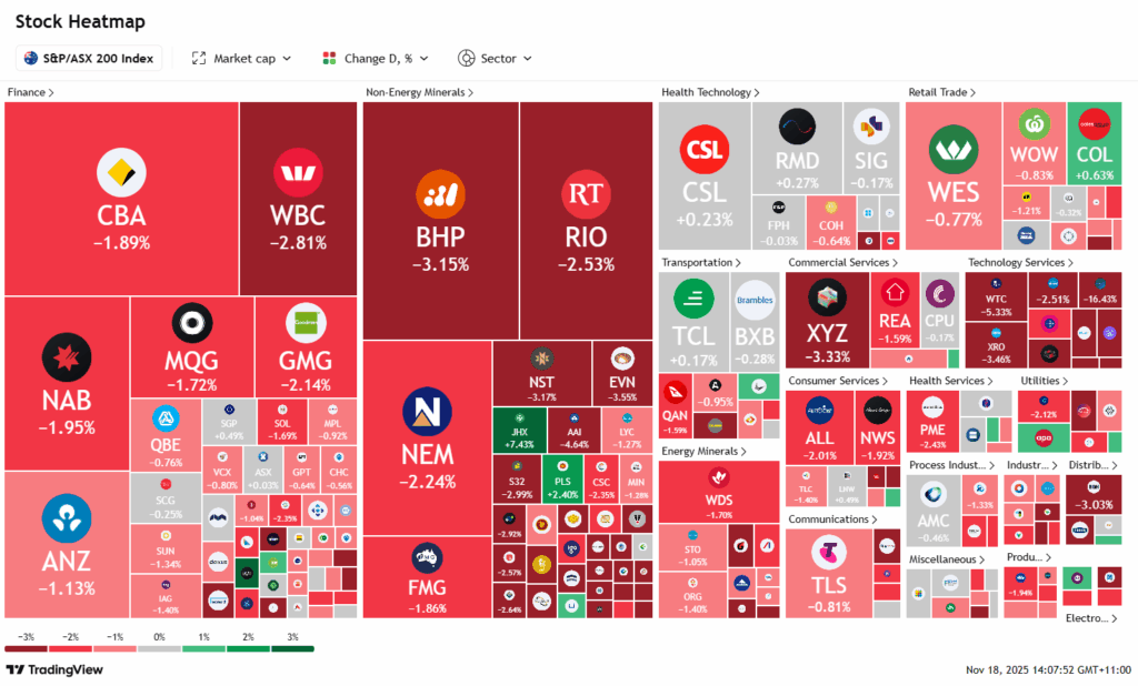 The Australian sharemarket fell sharply on Tuesday, with the S&P/ASX 200 dropping 1.4 per cent to 8517.70 by midday AEDT—its weakest level since June. A steep sell-down in technology stocks led the decline, driven by investor caution ahead of Nvidia’s earnings and renewed uncertainty over the interest-rate outlook. The sector tumbled 5.4 per cent, with TechnologyOne plunging 14 per cent after its annual recurring revenue outlook disappointed, while WiseTech and Xero fell 5.1 per cent and 3.8 per cent respectively.