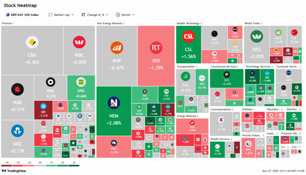 Gains in gold miners, supported by a jump in the spot gold price to US$4168 an ounce, helped steady the index. Newmont lifted 2.2% and Bellevue Gold added 3.2%. However, iron ore majors retreated as prices eased in Singapore, with BHP, Rio Tinto and Fortescue all lower.