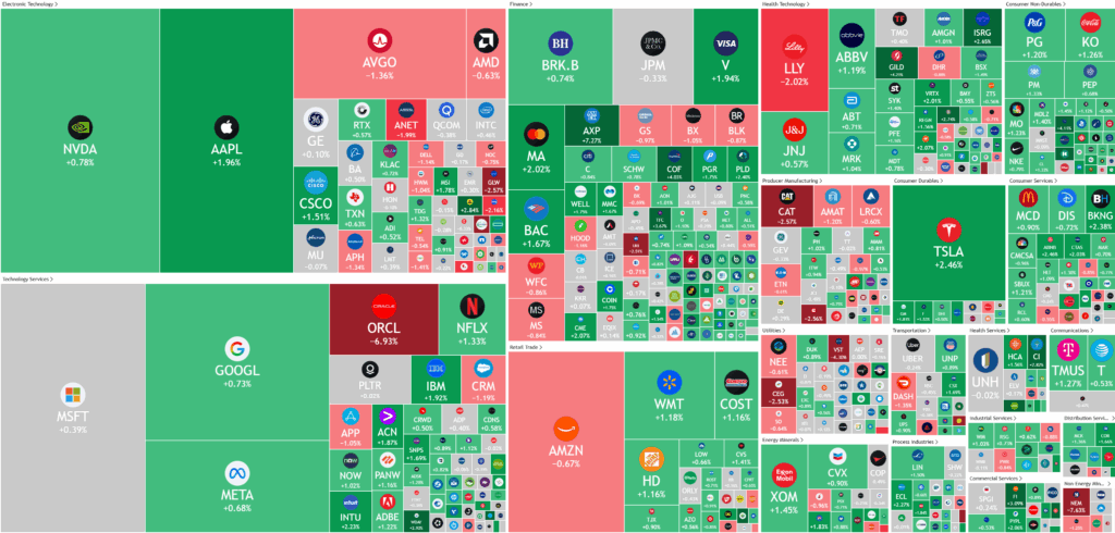 Wall Street extended its weekly gains as optimism over big bank earnings and Trump’s trade comments lifted markets. The S&P 500 rose 0.53% to 6,664.01, while the Nasdaq and Dow each gained 0.52%. Investor confidence returned to the financial sector, with the S&P Composite 1500 Regional Banks index climbing 1.8% after steep prior losses. Consumer staples led broad market gains, and volatility eased as the CBOE VIX dropped to 21.5. Tech stocks showed mixed results—Tesla and Apple advanced, while Amazon slipped. Overall, strong earnings and stabilizing sentiment helped major indexes post their best week in over a month.