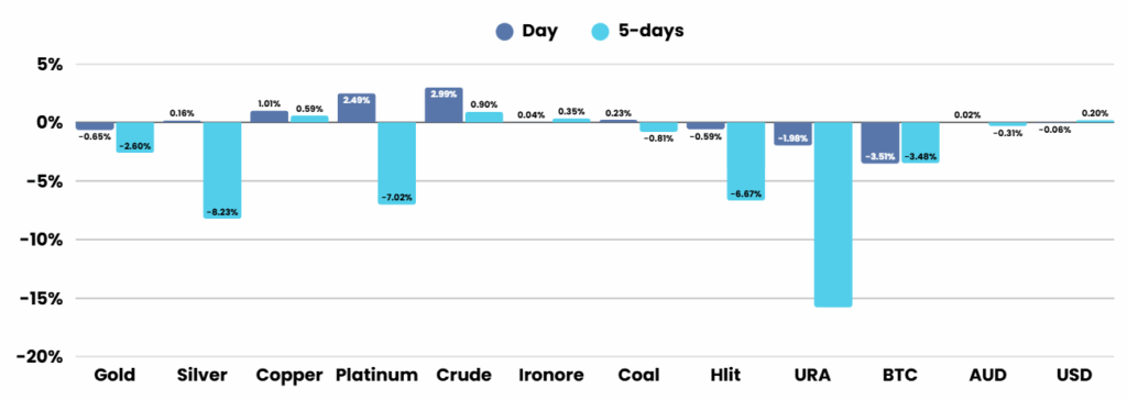 The Australian sharemarket pulled back from record highs on Wednesday, with the S&P/ASX 200 dropping 0.9 per cent to 9009 as a steep plunge in gold and silver prices sparked a broad sell-off in mining stocks. Major miners like BHP, Newmont, and Bellevue Gold were hit hard, while gains in energy and financial stocks, including Woodside and Pinnacle Investment Management, helped limit losses. Among standout movers, 4DMedical surged on a US rollout milestone and Adairs climbed despite issuing softer sales guidance.