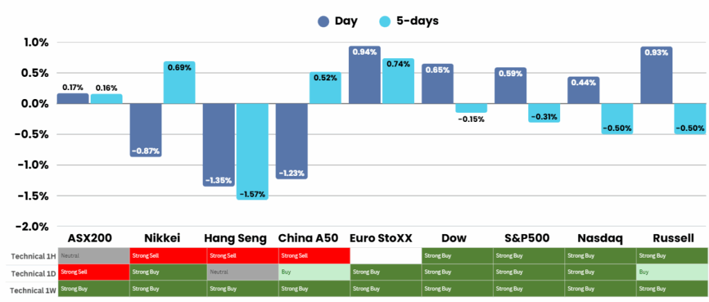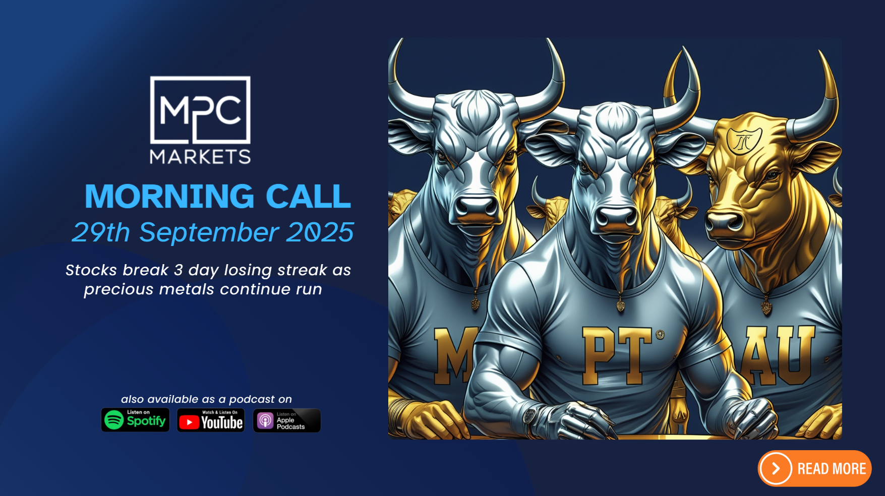 Overnight – Stocks break 3 day losing streak as precious metals continue run