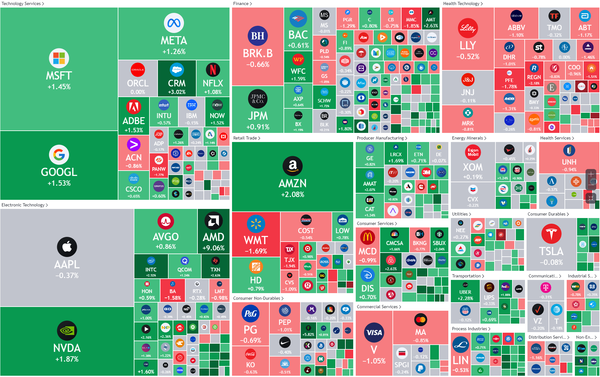 - Salesforce, up 3%, rolled out its first-ever quarterly dividend and boosted it buyback program offsetting full-year guidance that fell short of analyst estimates. Some on Wall Street believe customer relationship software maker is poised to take advantage of the artificial-intelligence boom, paving the way for increased market share.