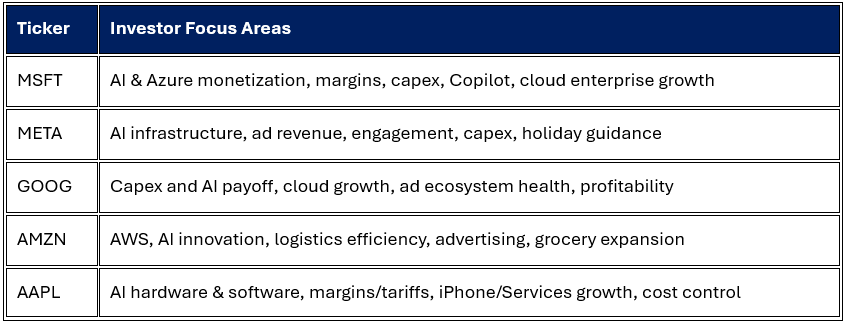 Investors are generally looking for confirmation that heavy AI investments are starting to convert into profitable growth, with particular attention given to margin management and whether these companies can sustain or accelerate growth amid intense global competition and operational shifts