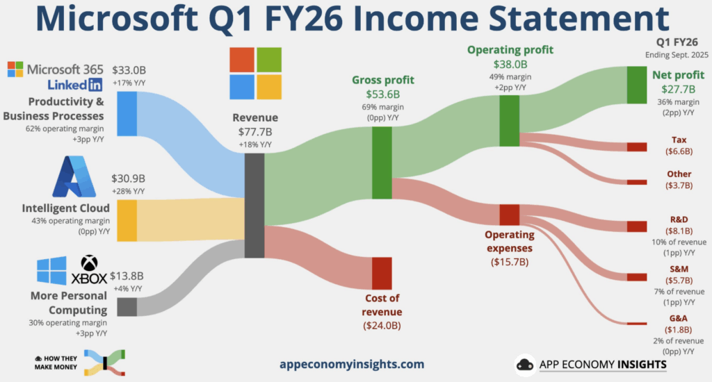 Microsoft -2.5% – Microsoft reported strong fiscal first-quarter results with earnings per share of $4.13, topping estimates of $3.66, and revenue of $77.7 billion, up 18% year over year. Azure’s cloud business surged 40%, surpassing forecasts, and the Intelligent Cloud unit’s revenue climbed 28% to $30.9 billion. Despite these gains, shares dipped 3% in after-hours trading as investors reacted to Microsoft’s massive $34.9 billion AI-related capital spending, well above expectations. The company’s deepening AI investments, including its renewed 27% stake in OpenAI, continue to drive growth, helping it reach a $4 trillion valuation—second only to Nvidia.