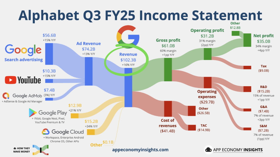 Google +8.11% –  delivered a record-breaking third quarter, posting revenue of $102.35 billion—up 16% year-over-year and above forecasts—while earnings per share reached $2.87 versus the expected $2.29. Driven by strong growth in advertising, cloud, and AI services, the company’s net income rose 33% to $34.98 billion, and operating margin hit 30.5% (33.9% excluding fines). Google Cloud revenue surged 34% to $15.16 billion, supported by booming AI demand, while total ad revenue climbed 13% to $74.18 billion. Shares jumped over 6% after-hours to $275.17, marking gains of 44.9% in three months and 56.2% year-over-year, as Alphabet raised its full-year capital expenditure outlook to $91–93 billion amid escalating competition in AI and search.